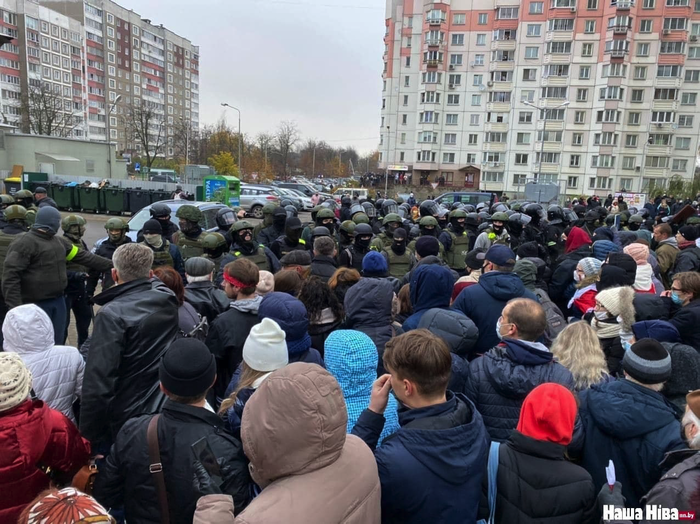 Минск. Ряд неизвестных в касках в районе улицы Веры Слуцкой, силовики задерживают некоторых людей