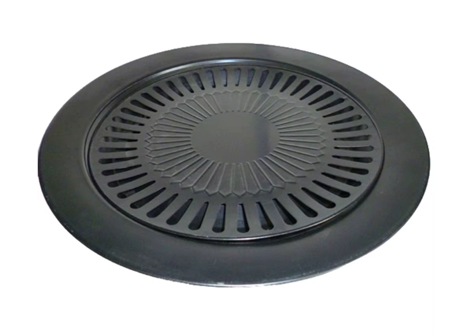 Корейская тарелка отличается глубокими канавками и антипригарным покрытием, благодаря которым продукты готовятся равномерно, а жир стекает в отдельные секции.