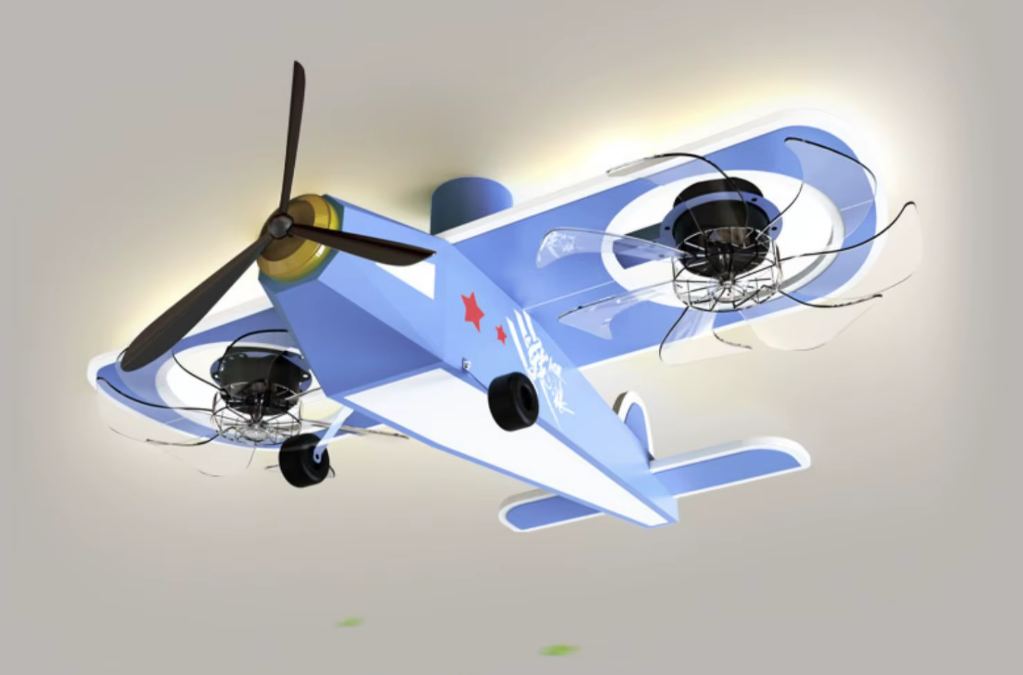 Потолочный светильник Orcinus orca создаёт в помещении лёгкую атмосферу игрушечного полёта и становится центральным элементом интерьера. Форма корпуса напоминает мультяшный самолёт с двумя винтами, что делает светильник не просто источником света, а частью визуального образа комнаты.