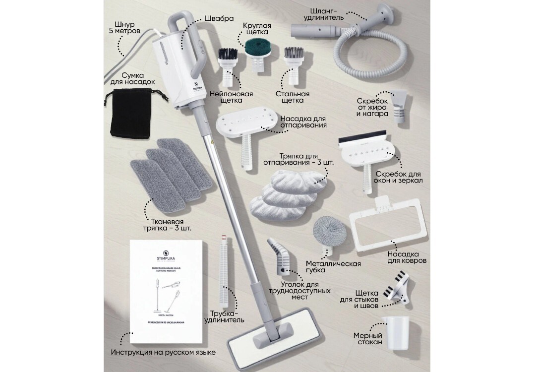 Stimpura HD-QJ206 — гибкая и компактная швабра с множеством насадок, которые позволяют чистить и плитку, и межплиточные швы, и даже мягкую мебель. Напор пара хорош, уборка без химии — плюс для тех, кто заботится о здоровье.