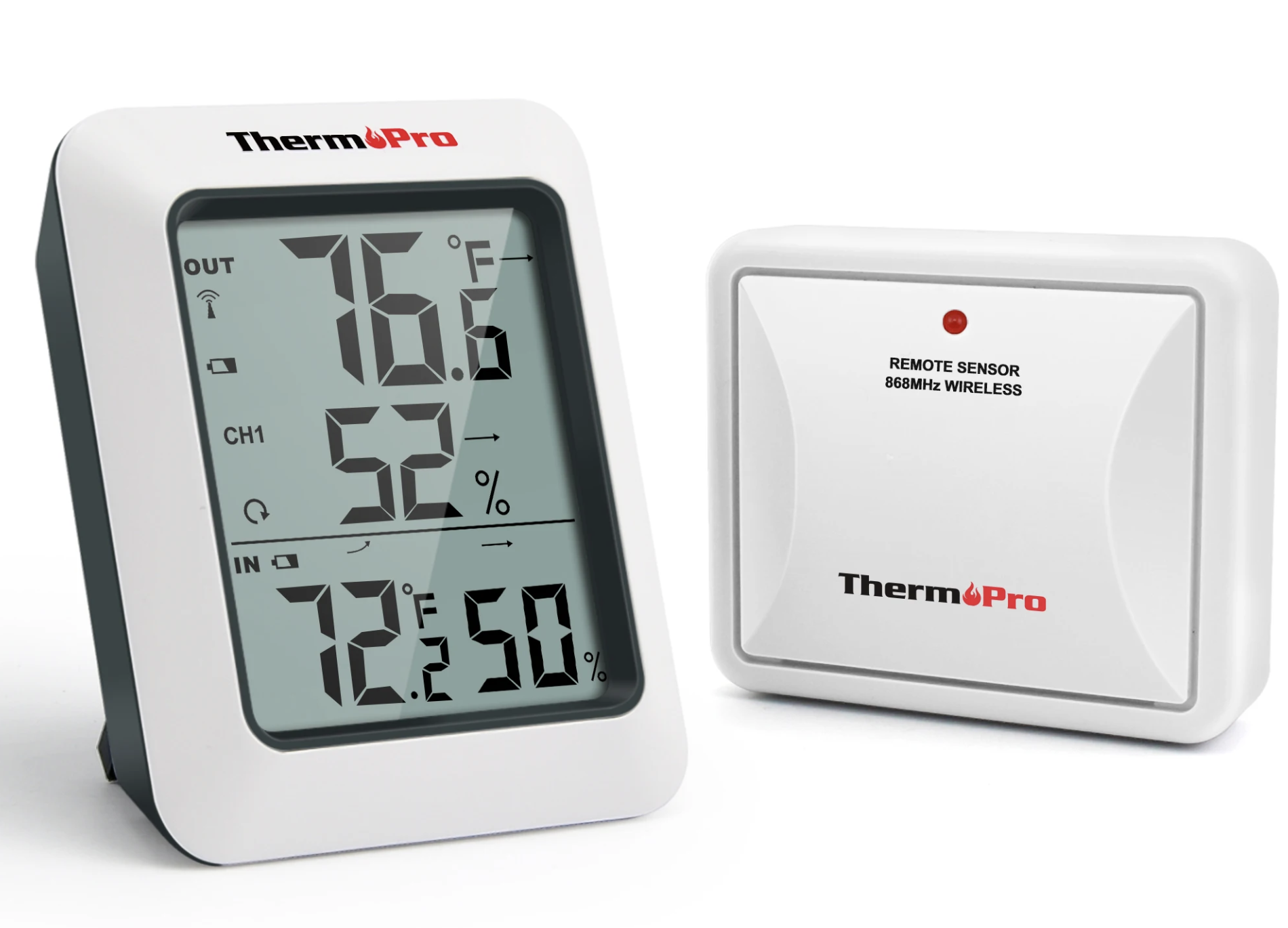 ThermoPro TP60C Беспроводной термогигрометр для дома подходит для контроля температуры и влажности в комнатах, на балконе или в кладовой. Беспроводной формат удобен, когда датчик стоит в одной зоне, а показания хочется видеть в другой, не подходя постоянно к месту измерения.