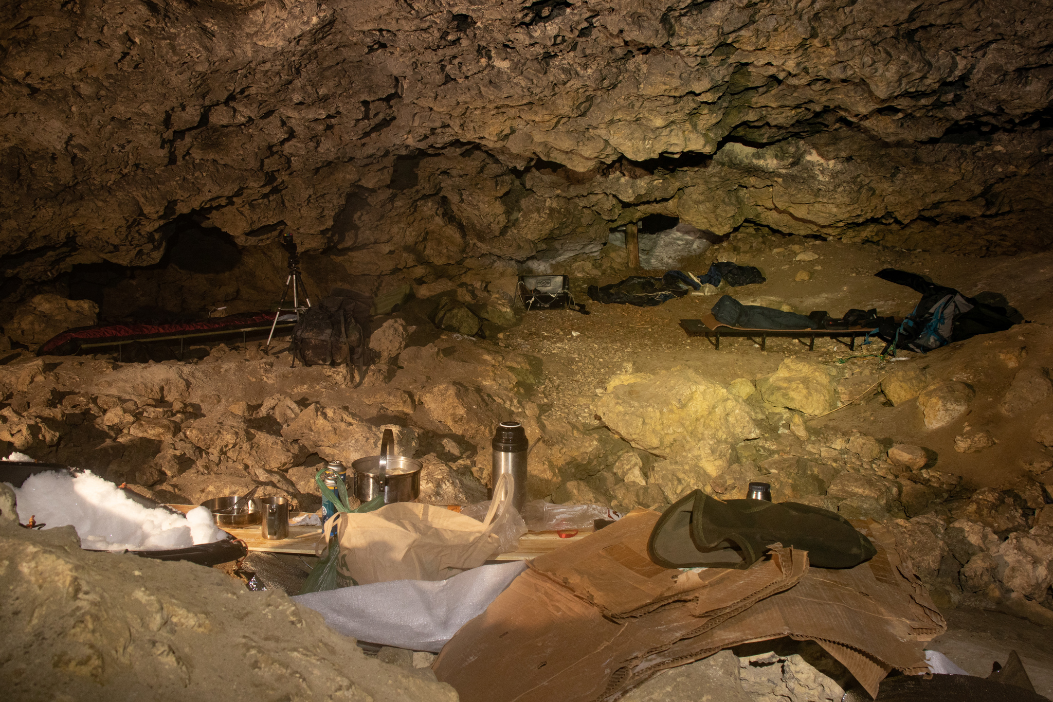 В пещере Степана Разина температура была -5, что вполне подходило для наших зимних спальников. Разложили раскладушки на самых ровных местах, завесили палаткой вход, сварили пельмешек, хорошо покушали и приготовились к ночлегу. Кстати, в одном из лазов лежит дохлая лиса. Свеженькая. Вот такое соседство у нас получилось.