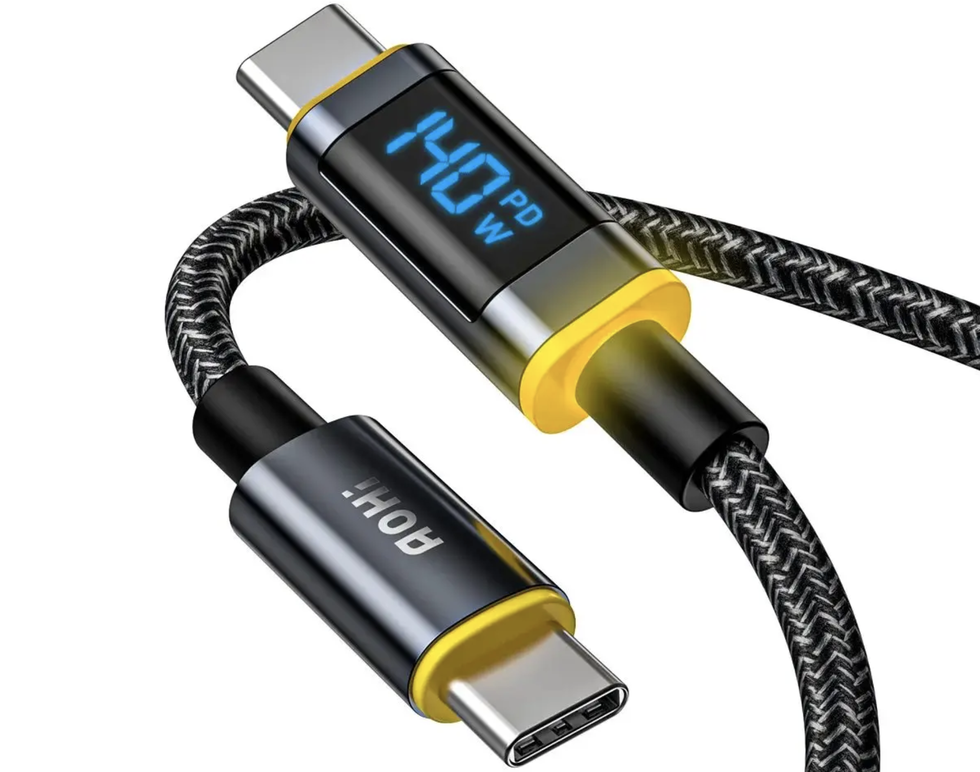 AOHI Magline + 140 Вт нейлоновый кабель USB C к USB C со светодиодным цифровым дисплеем длиной 1,2 м рассчитан на мощную зарядку и удобный контроль процесса. Дисплей помогает видеть параметры питания, а нейлоновая оплётка делает кабель более устойчивым к ежедневным перегибам.