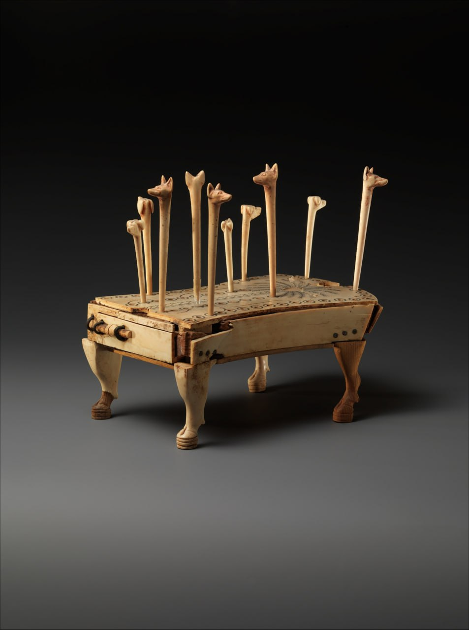 Для хранения игровых фигур в доске имеется выдвижной ящичек. Ножки доски выполнены в виде бычьих ног.