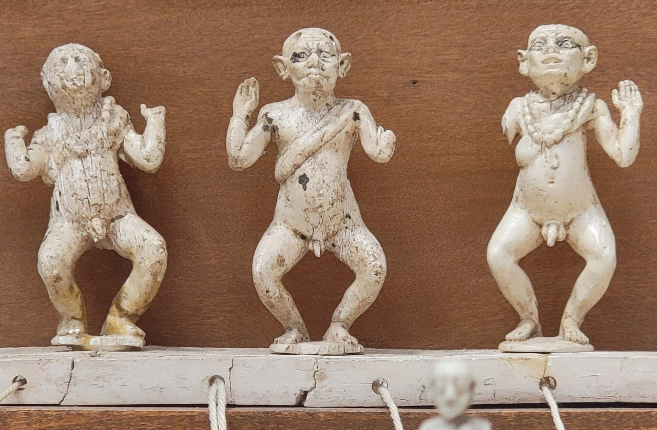 Три фигурки стоят на основании с просунутыми в него нитями, которые приводят пигмеев в движение.