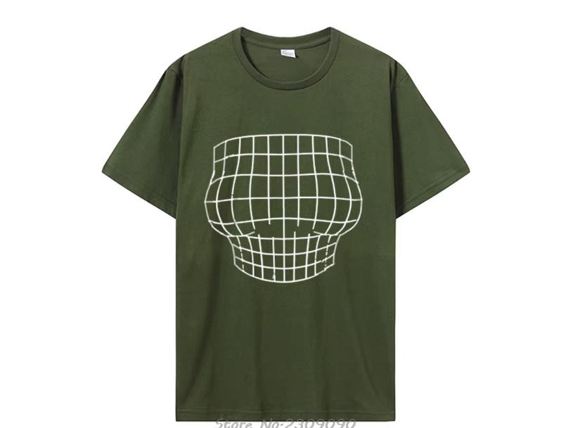 Забавная футболка, созданная в духе современных мемов и визуальных трюков. На ткани напечатан рисунок в виде трёхмерной сетки, создающий иллюзию объёма — будто грудь на самом деле увеличена. Эффект достигается благодаря точному расчёту линий и геометрии, из-за чего при взгляде спереди изображение кажется реалистичным и объёмным.