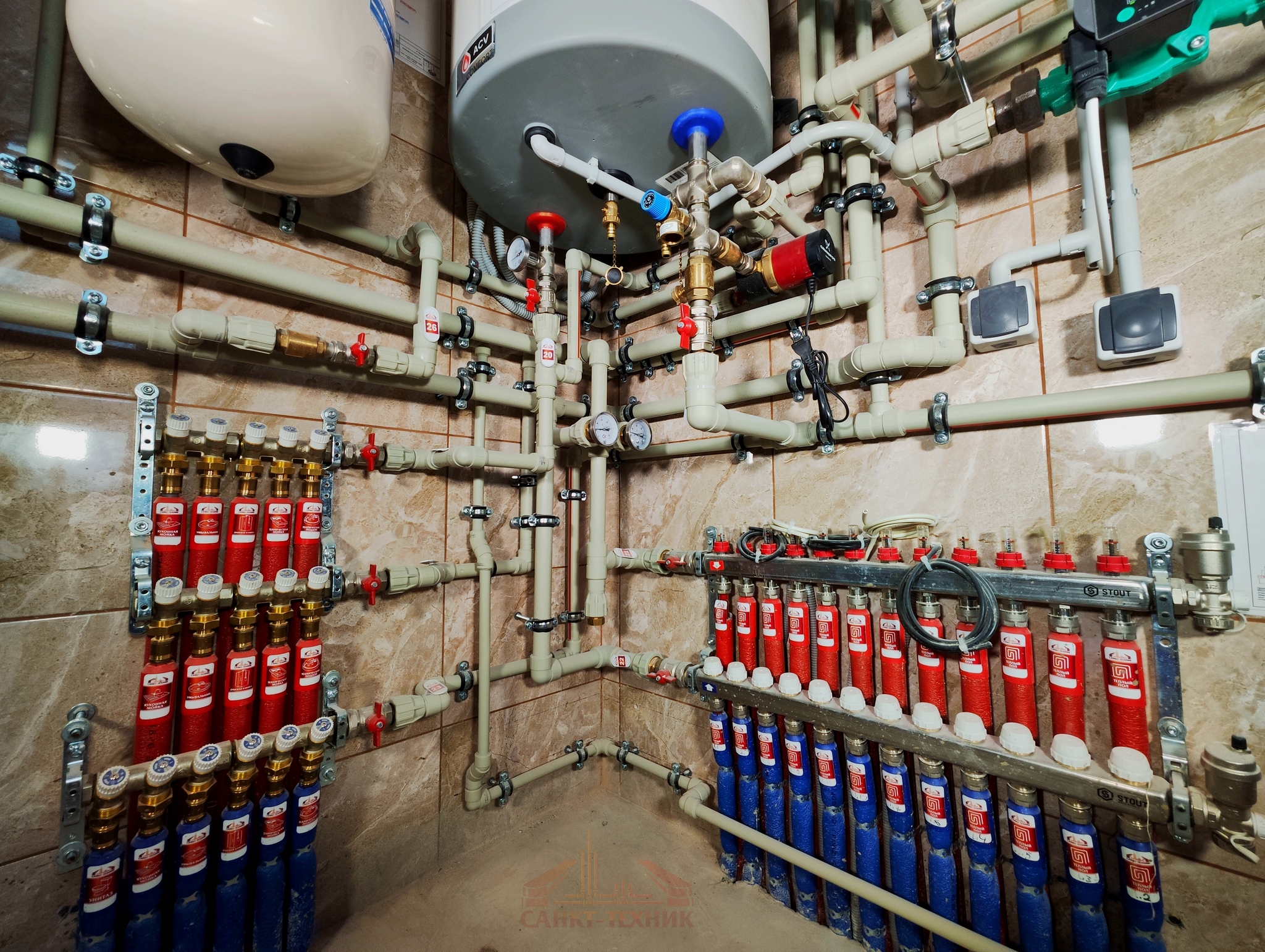 Так вот, здесь Антон изначально хотел классику с полами и радиаторами, но перед самым начало монтажа переиграл всё к чертовой матери и решил везде постелить плитку и получить только теплые полы во всех помещениях дома. Это Слава со своими бойцами и выполнил, завершив исполнением данной котельной с двумя котлами - газовым и электрическим. Пока газа нет, электрический котел пашет вовсю и будет зимой без проблем создавать во всех помещениях необходимую температуру для отделочных работ +10 градусов.