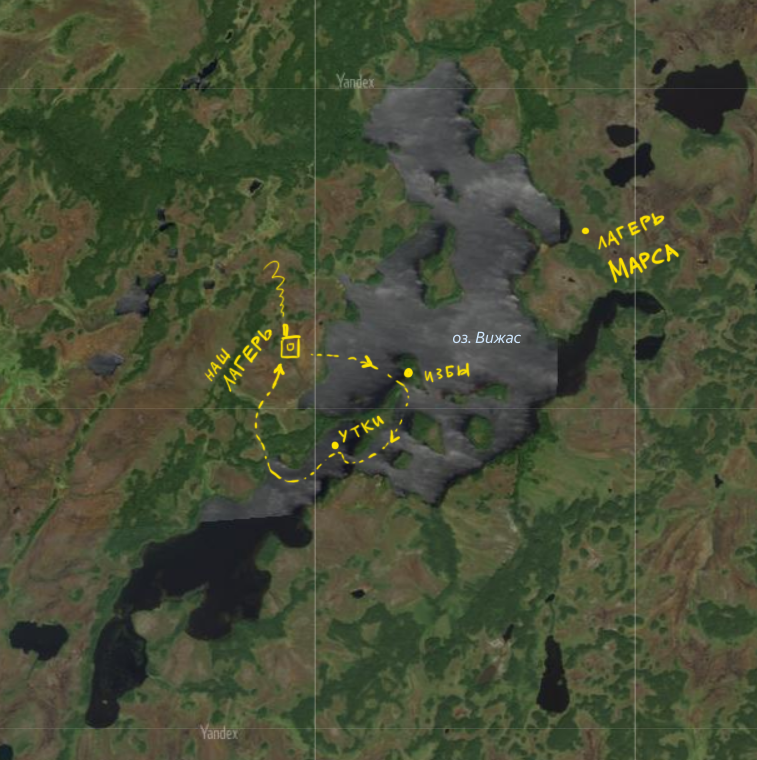 Середина сентября – замечательное время. Деревья разгораются алыми и золотыми свечами, утренние заморозки напрочь изгоняют из воздуха всякую летучую нечисть и даже грибы начинают радовать полным отсутствием червей. Но эти же самые заморозки заставили рыбу, жившую в реке, скатиться вниз, к устью, так что теперь я с нетерпением ожидал, когда же мы перелетим на новую точку – ведь там нас ждала встреча с озером Вижас – таким большим, что оно целиком даже не умещалось на нашей карте! «Вот уж там точно оторвусь по полной» - мечтал я, поглядывая на спиннинг.
