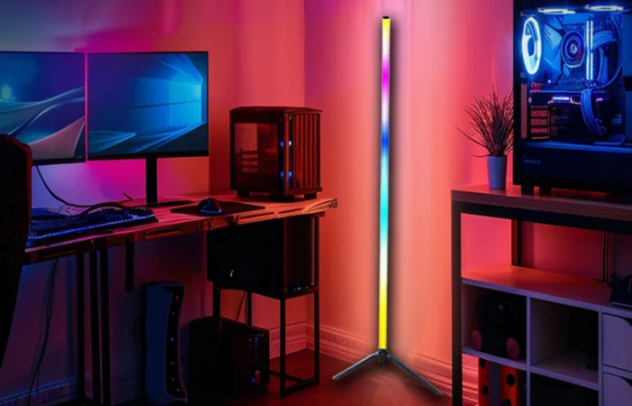 Современный напольный торшер YBXZN с RGB-подсветкой, создающий атмосферное освещение в помещении. Он может иметь минималистичный изогнутый дизайн и управляться с помощью пульта дистанционного управления или мобильного приложения для выбора различных цветов и световых эффектов.