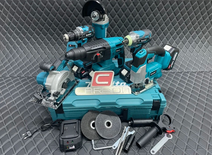 Универсальный набор аккумуляторных электроинструментов, включающий шесть различных насадок или базовых инструментов, таких как дрель/шуруповерт, шлифовальная машина, пила и другие.