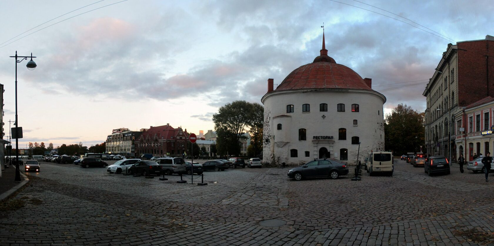 Круглая башня. Построена в самом начале XV века. Была частью Рогатой крепости, которую назвали таким словом из-за особого устройства угловых башен. Башня по форме представляет собой овал, но одна сторона овала плоская. Башня выступала за стену крепости, чтобы с нее можно было вести фланкирующий огонь по нападающим на крепость войскам. Башня такая вся несуразная, толстая и из-за этого очень красивая. Если подойти к башне со стороны входа в ресторан (в ней сейчас ресторан), то на мостовой видна фундаментная кладка стен крепости. А стены башни внизу достигают толщины 4 метра, а сверху - 3 метра.