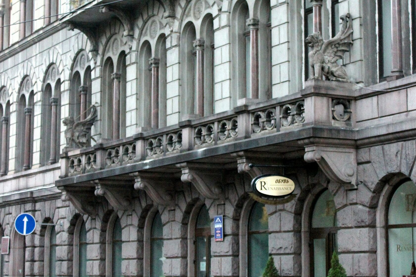 Здание очень солидное. Его хорошо фотографировать в пасмурную погоду, оно покрыто темным камнем и выглядит строго. Тут тоже раньше был банк, назывался Объединенный банк северных стран. Балкон второго этажа украшен двумя фигурами грифонов.