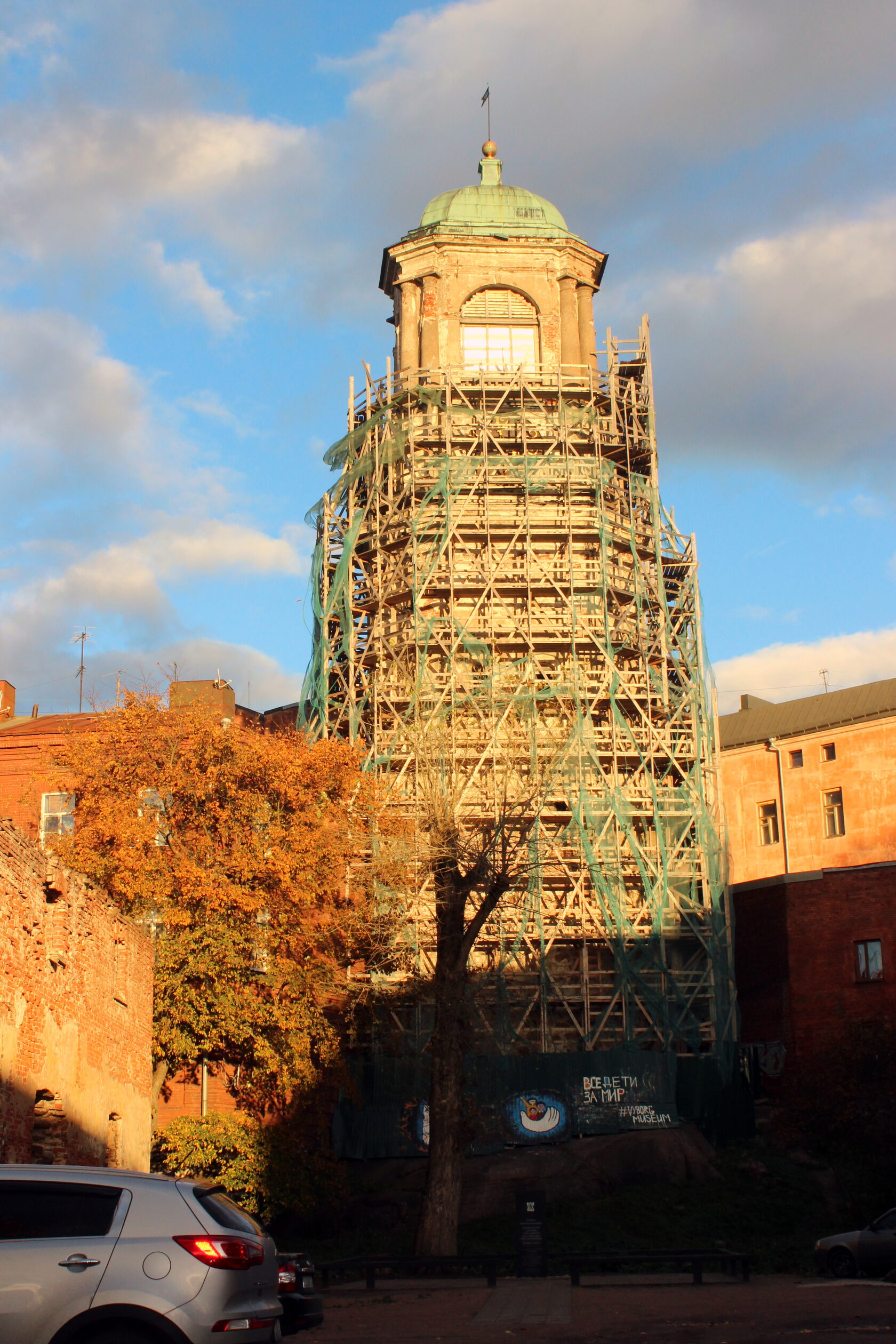 Часовая башня и руины собора. Не знаю, как его правильно называть, потому что в течение его истории он много раз менял свою религиозную принадлежность и названия. Башня построена в 1490 году. Сначала она была частью католического собора Девы Марии и святого Олафа, потом собор стал лютеранской церковью. Когда в 1710 году наши взяли Выборг, то открыли православный собор во имя Рождества Христова. С 1918 года - опять лютеранская кирха. Разрушена в 1940 году. Можете поискать в интернете современные фотографии башни, уже отреставрированной.