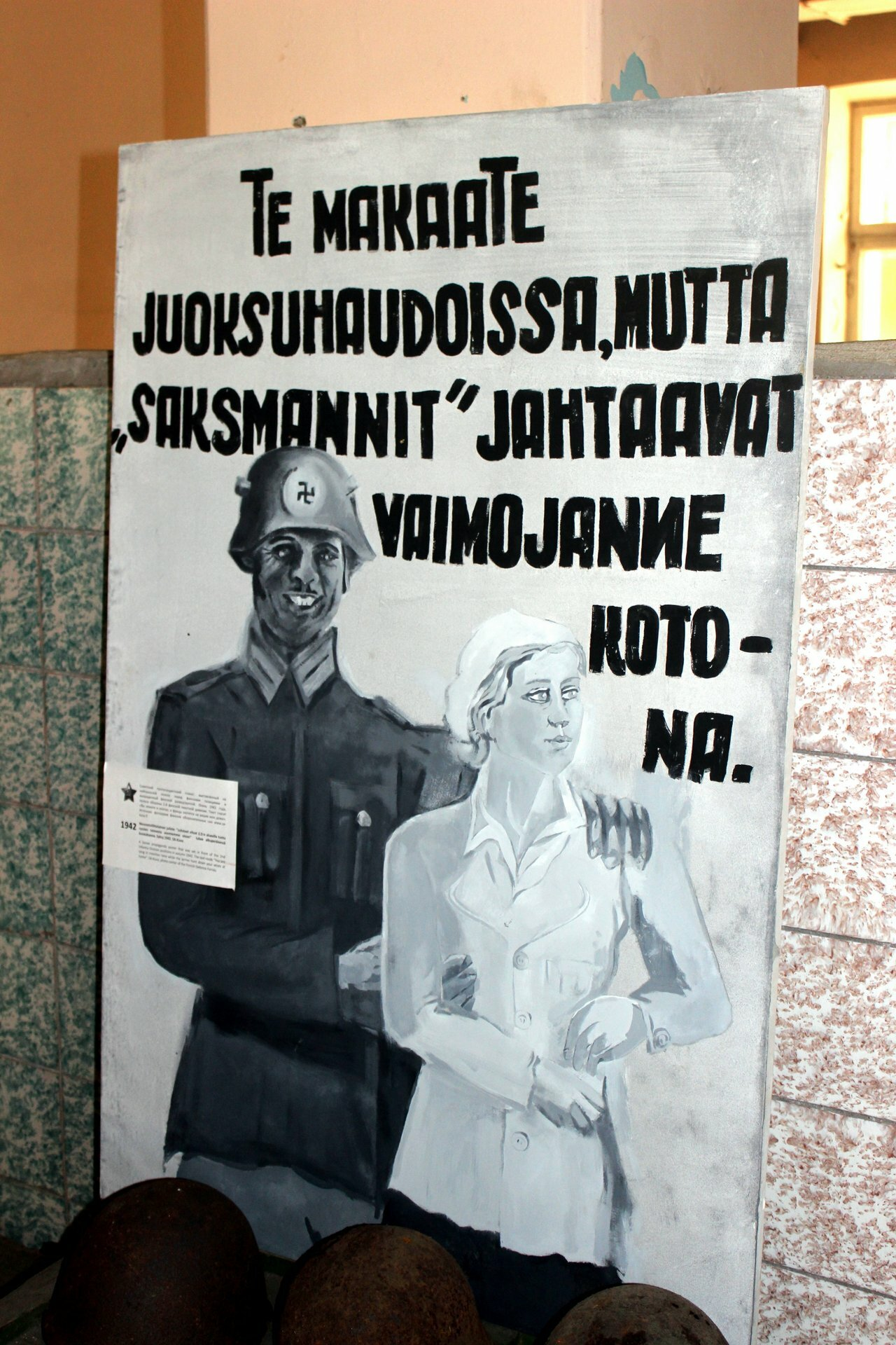 Или вот плакат, который наши бойцы нарисовали для финнов во время Великой отечественной войны, который вольно после переводчика Google с финского можно трактовать, как: "Пока вы тут лежите в окопах, немцы обнимают ваших жен дома".