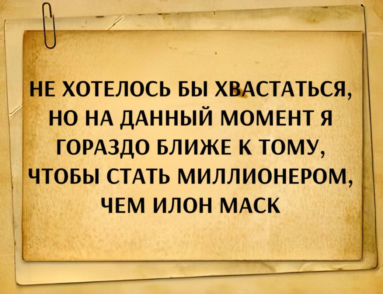 465 terebiata Юмор для всех и каждого +1 достижение 6 месяцев назад Телеграм канал - https://t.me/roflemem/5293 Юмор Картинка с текстом Мемы Илон Маск Богатство Telegram (ссылка) 26 2 1 1 1 Ещё 0