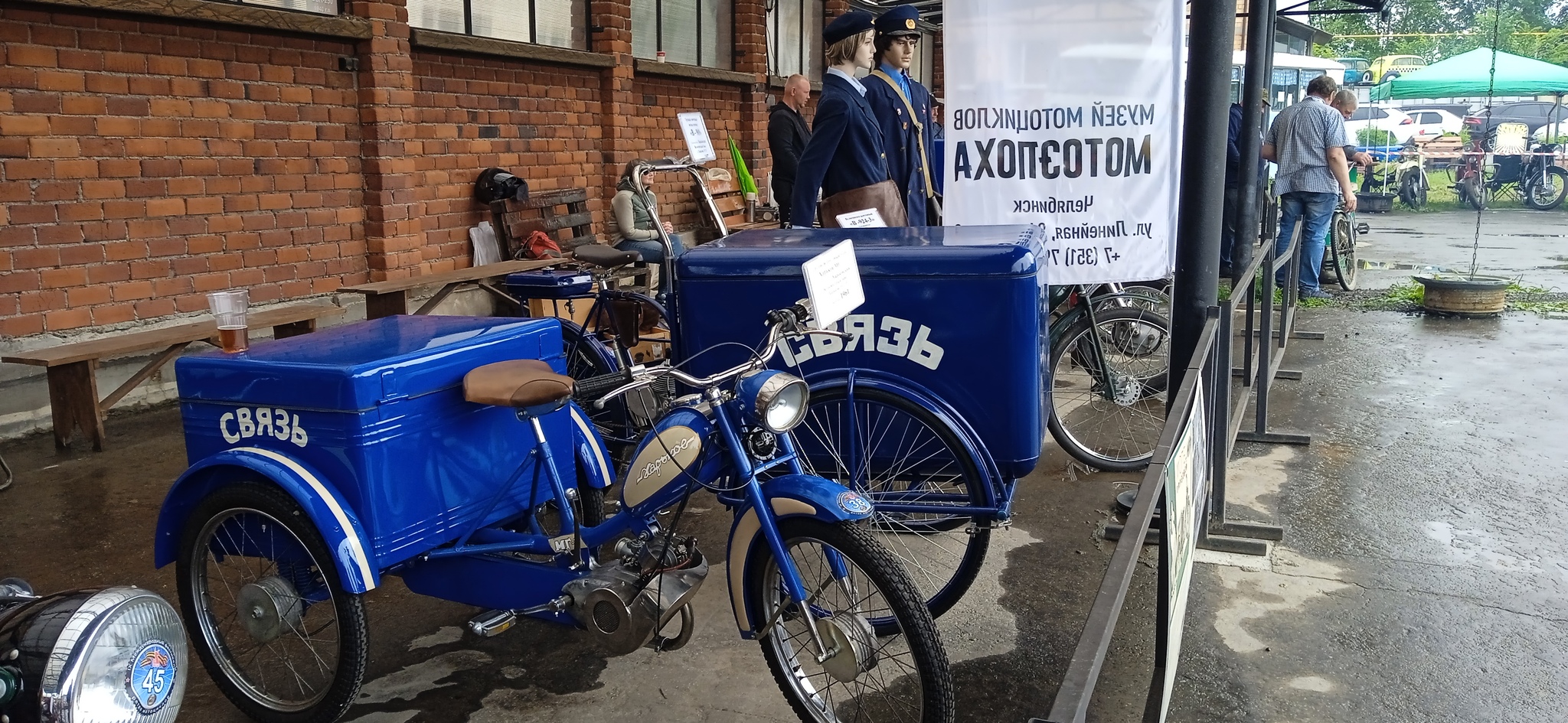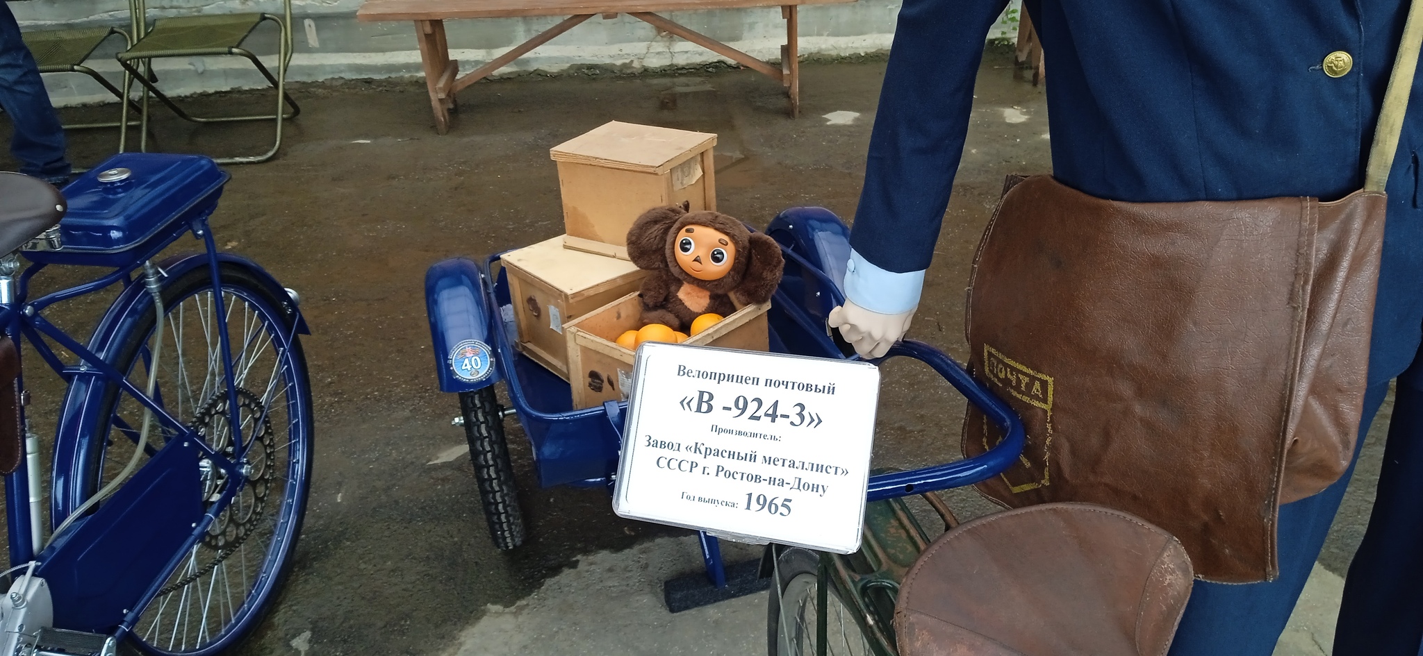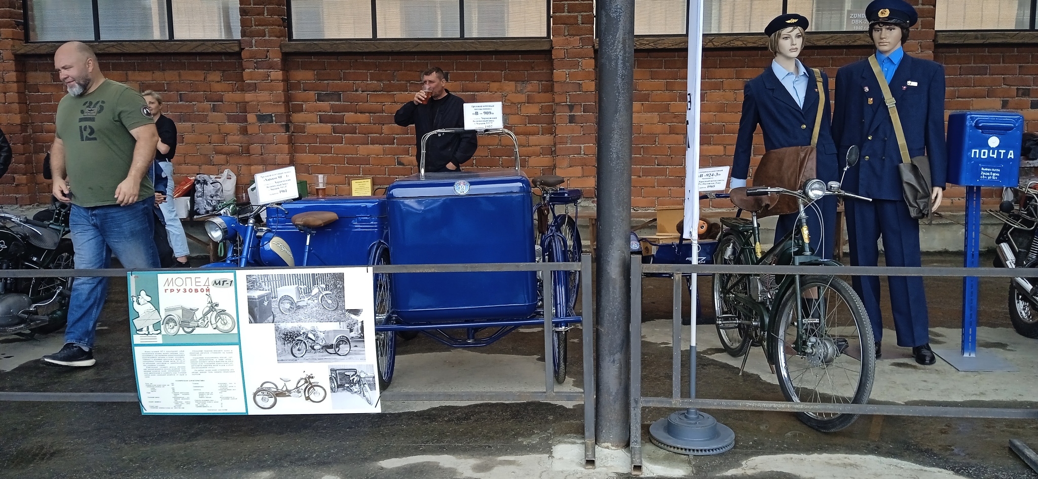 Наш музей был представлен экспозицией "Почта" - мопед почтовый грузовой "МГ-1" Харьков" и почтовый грузовой мотовелосипед "В-909". Так же экспозицию дополняли грузовой велоприцеп В-924-3, почтальоны, почтовый ящик и.. Чебурашка😁