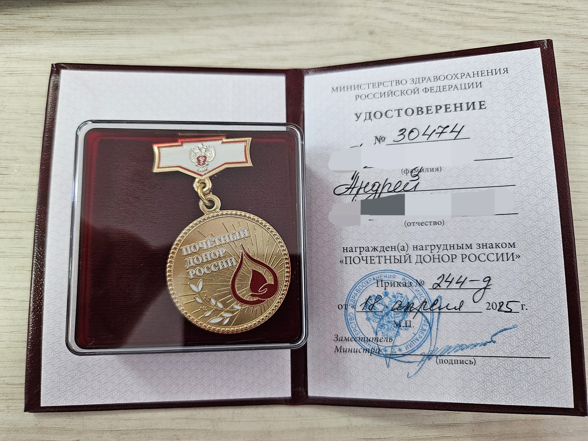 Почти через 3 года после Почетного донора Москвы получил Почетного донора России.
