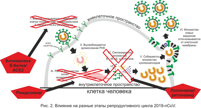 В предыдущей заметке мы рассматривали жизненный цикл 2019-nCoV. Итак, как мы уже знаем, 2019-nCoV использует рецептор ACE2 для того, чтобы попасть внутрь клетки. С АСЕ2 рецептором 2019-nCoV взаимодействует своими S-белками суперкапсида. В клетке он умножает свой геном и синтезирует множество белков суперкапсида, которые позже используются для сборки вирусной частицы. Каждый из этих этапов – перспективная цель для тех или иных лекарств: ведь если хоть один будет нарушен, воспроизведение вирусы прервется (Рис. 2).