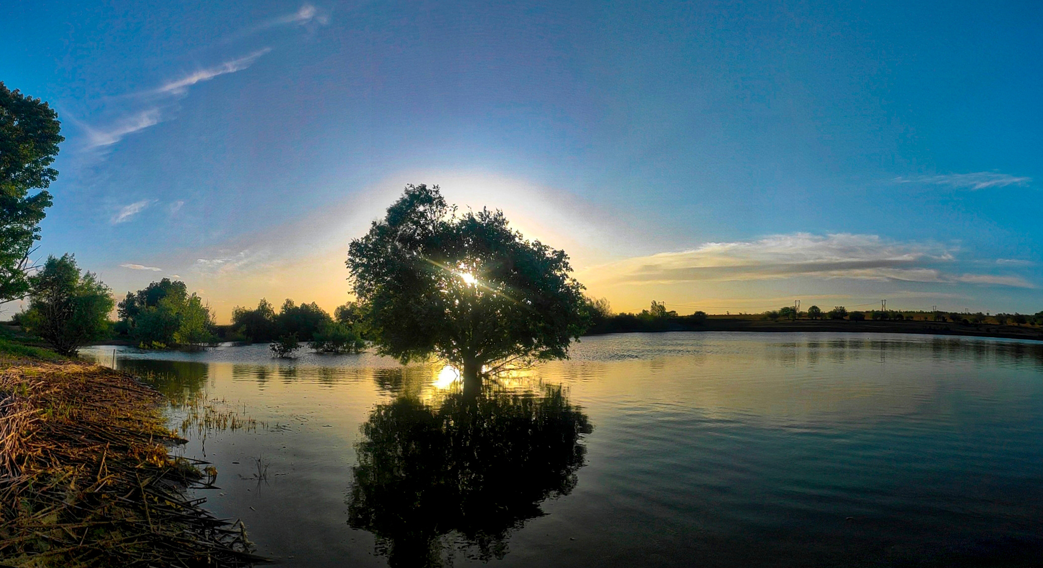 А это Чупрыновский ставок. Один из четырёх. Ближайший к Ростовской трассе. Первое фото сделано 29 мая 2024. И то, надо сказать. В апреле 2024 насыпало очень много снега и поэтому в мае дерево стояло ещё в воде. Весна 25 года обошлась без осадков, как и зима. В мае 2025 от воды не осталось и следа.