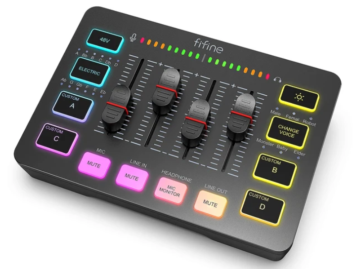 Профессиональный аудиомикшер с яркой подсветкой и независимыми регуляторами. Подключение микрофонов, гарнитур и ПК. Поддержка стримов, подкастов, караоке и игр. Настраиваемые эффекты и простой интерфейс.
