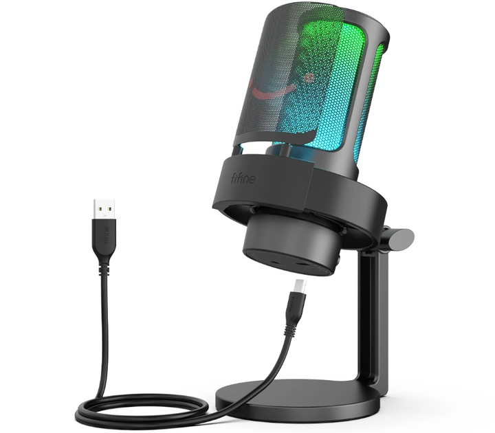 Проводной микрофон для стримов, подкастов и озвучки. Премиальное качество записи, чувствительная капсула и RGB-подсветка. Подключается через USB, совместим с Windows и Mac. В комплекте антишок и подставка.