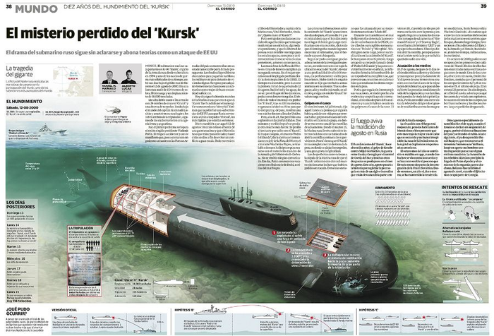 Выдвигалось множество версий причин гибели АПЛ. Среди них — расхищение оборудования на драгметаллы, попадание ракеты с крейсера "Пётр Великий", мина времён Второй мировой, общее запущенное состояние флота в 90-е гг. Восемь лет назад "Правда.Ру" первой выдвинула версию о столкновении "Курска" с американской субмариной. На её основе французский режиссёр Жан-Мишель Карре снял фильм "Курск": "Подводная лодка в мутных водах" (2005 г.).