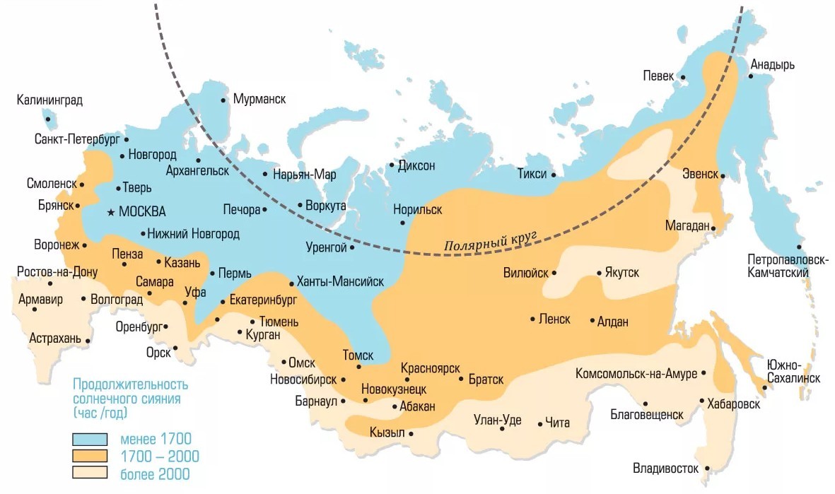 80% территории России получают менее 2000 часов солнечного сияния в год.