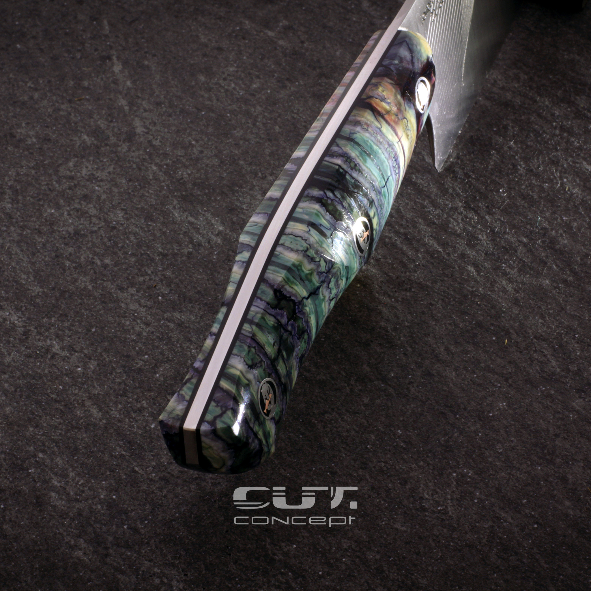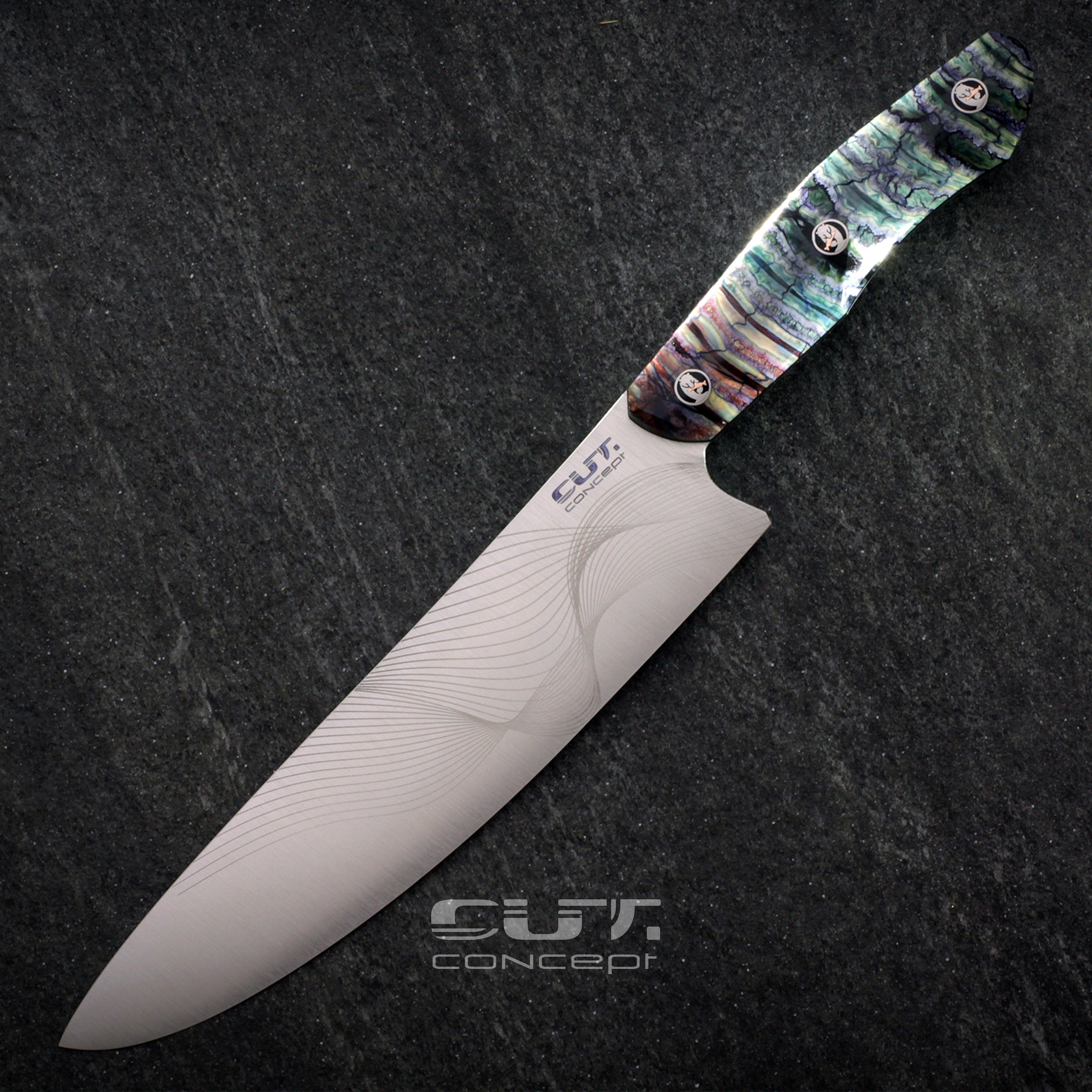 Итак, строй клинка классический европейский шеф нож с конвексом, толщина сведения 0.15мм, толщина обуха 2.5мм. порошковая сталь последнего поколения Lomax.