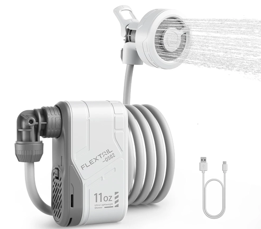 Электрический душ для походных условий. Просто опустите насос в ёмкость с водой — и получите полноценный напор. Подходит для мытья, уборки снаряжения и даже купания собак!