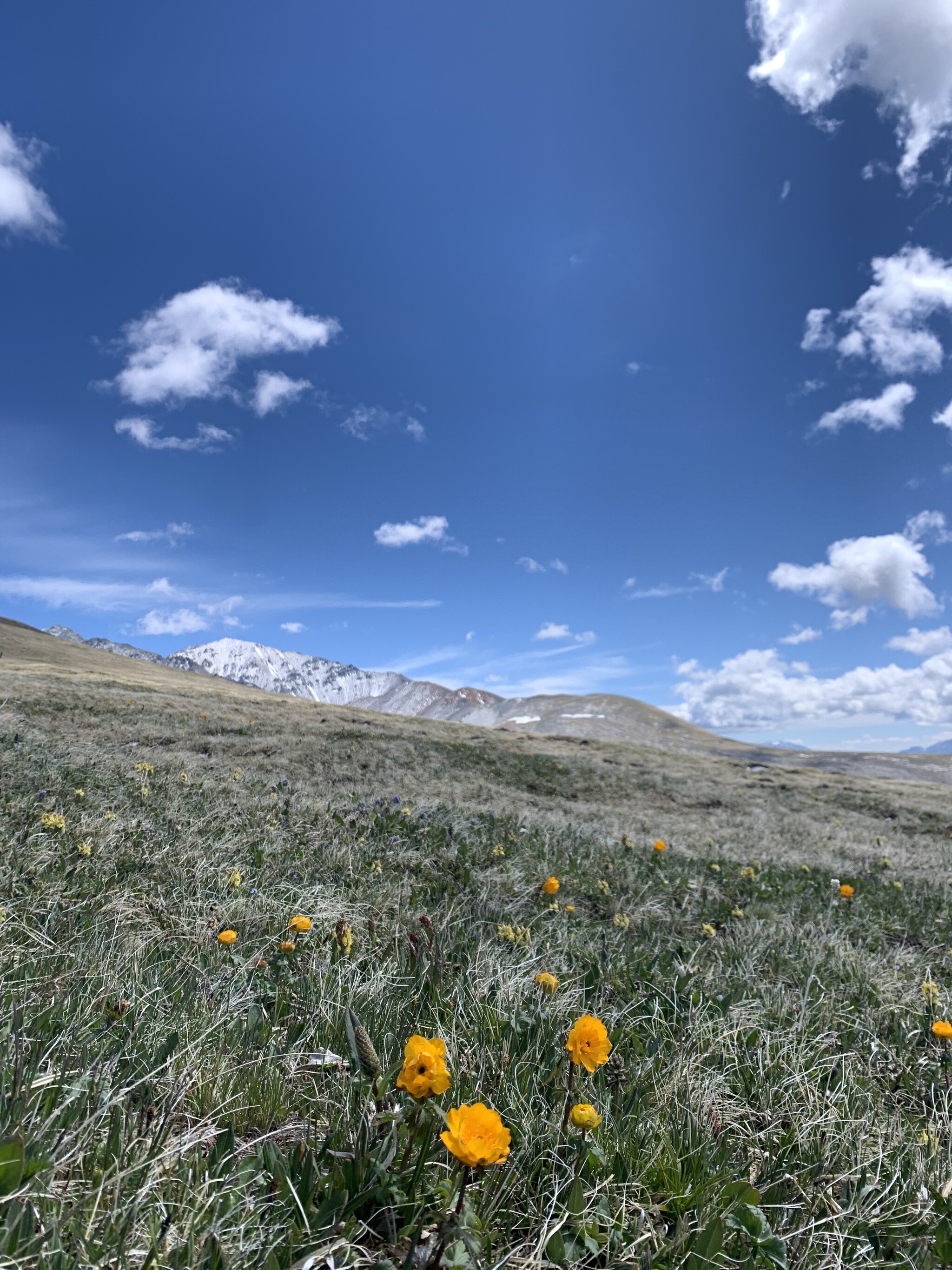 Погода здесь менялась стремительно. Если внизу был теплый летний денек, то здесь уже невозможно было идти без куртки. Вокруг были просто невероятные виды — просторы зеленых альпийских лугов, усыпанные ярко-оранжевыми точками алтайских огоньков.