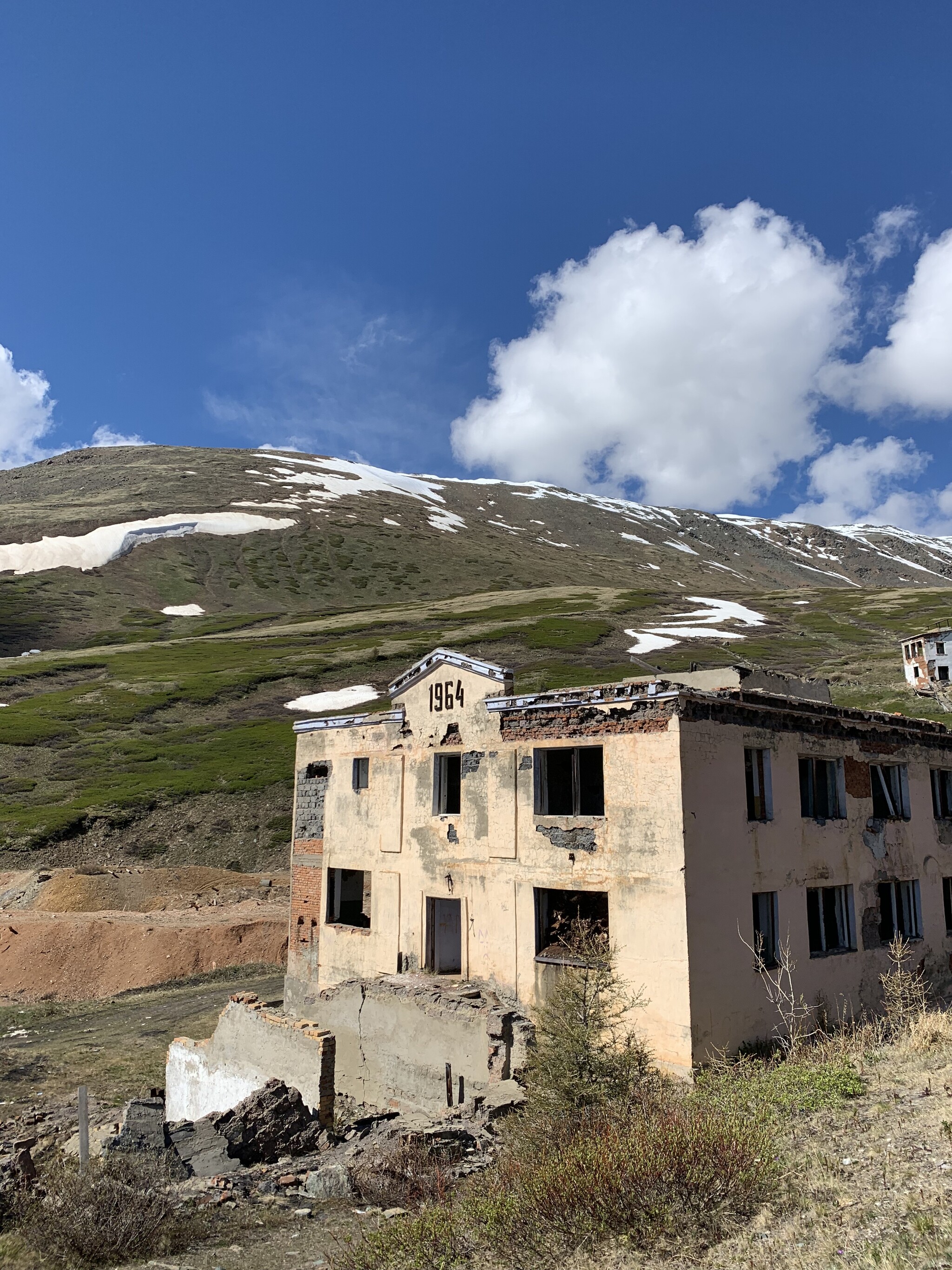 Мы подходили к заброшенному Акташскому руднику. В советские годы здесь добывали киноварь — ртутную руду. Раньше тут был целый поселок для рабочих, а теперь осталось лишь несколько заброшек, которые атмосферно выглядят на фоне окружающих пейзажей.