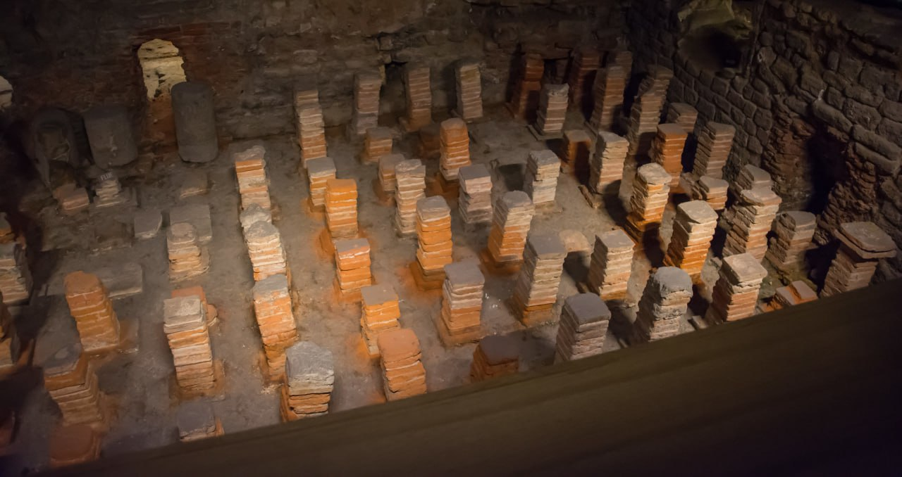 На фотографии изображена часть системы гипокауста, которая находилась под полом. В пространство между столбами нагнетались горячие воздух и дым из отдельно стоящей печи, которые затем поднимались по дымоходам в стенах комнат, тем самым обогревая не только полы, но и стены.