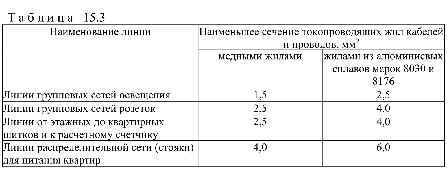 Подробности - СП 256.1325800.2016 "ЭЛЕКТРОУСТАНОВКИ ЖИЛЫХ И ОБЩЕСТВЕННЫХ ЗДАНИЙ Правила проектирования и монтажа" (Изм. №3), Табл. 15.3.