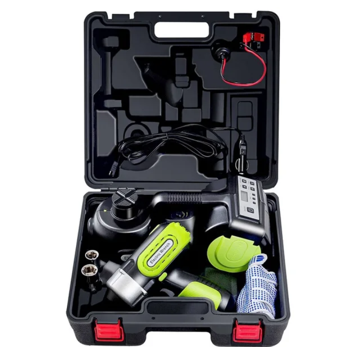 Устройство 3-в-1 с функциями подъёма, освещения и откручивания колёс. Работает от 12 В и способен поднять до 5 тонн. Подходит для шиномонтажа и ремонта в дороге. Укомплектован кейсом и всем необходимым.