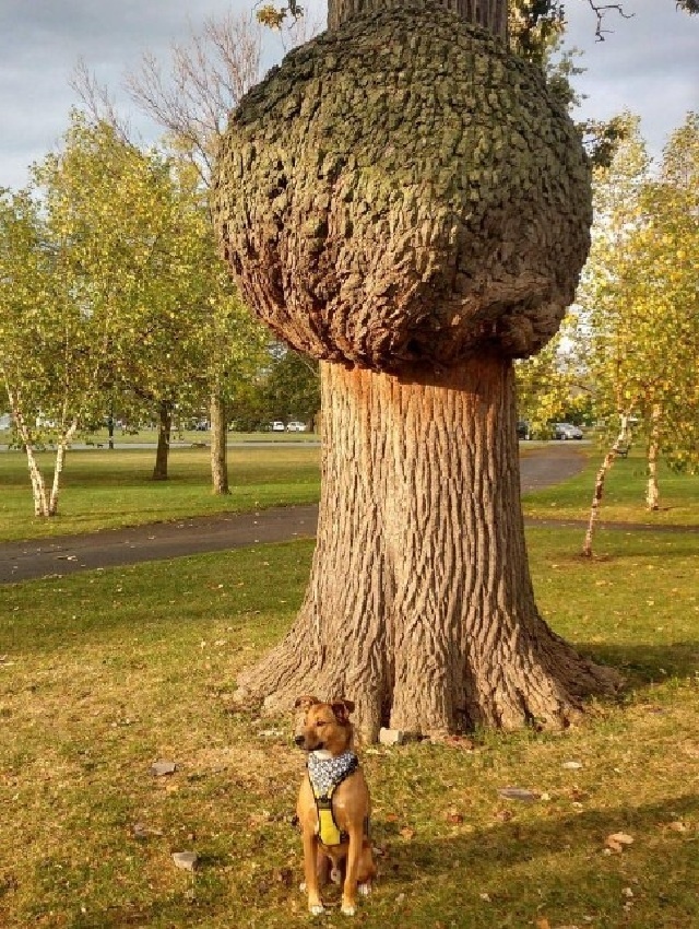 Огромный нарост на дубе, чтобы понять его масштаб, рядом сидит пёс весом 30 кг
