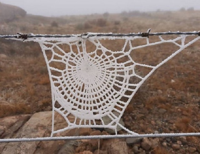 Замёрзшая на морозе обычная паутина выглядит словно связанная крючком салфетка