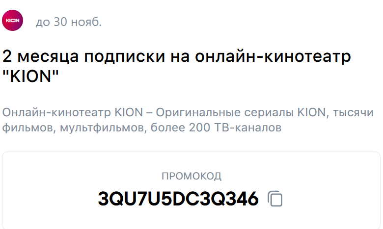 2 месяца подписки на онлайн-кинотеатр "KION"
