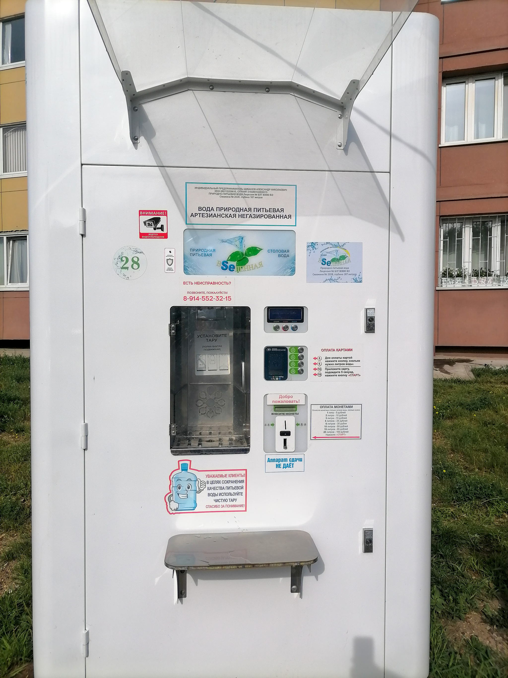 Недалеко, через дорогу, стоит вот такой автомат по продаже воды. 5 рублей за литр. Никогда раньше таких не встречал.