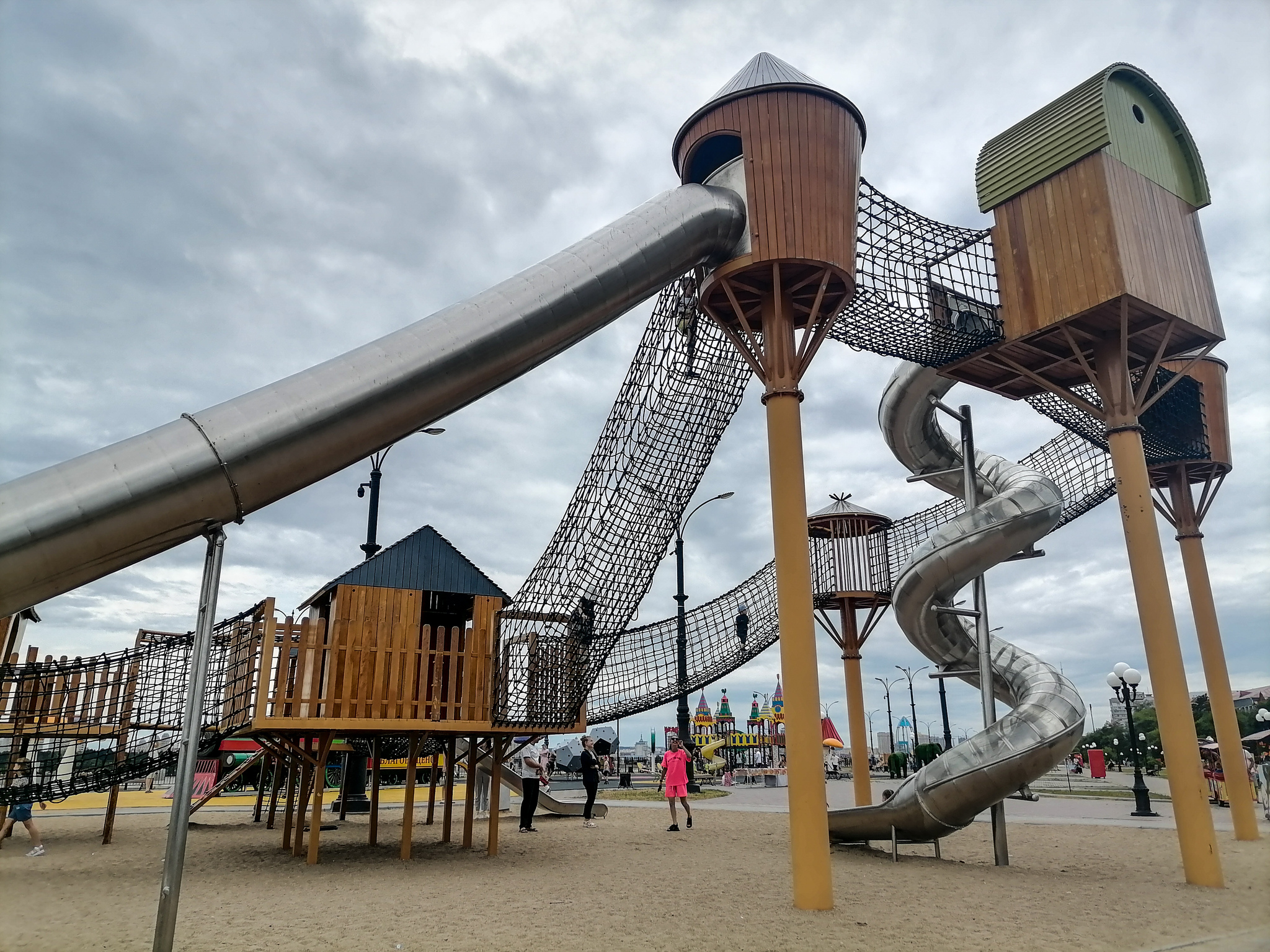 Но вот наконец-то мы добрались до набережной. Первое что бросается в глаза - огромная горка на детской площадке. Отпускаем детей туда, а сами наслаждаемся минутами отдыха.