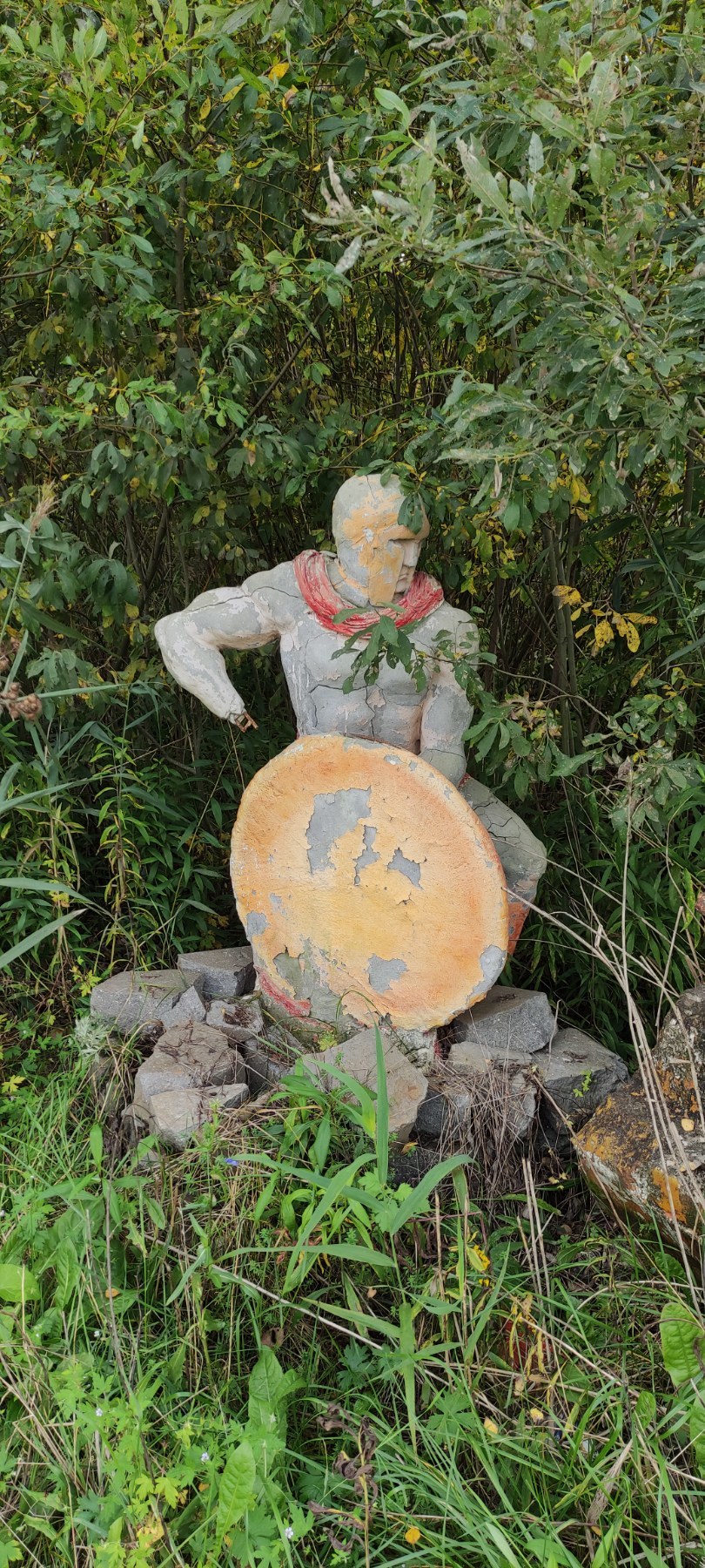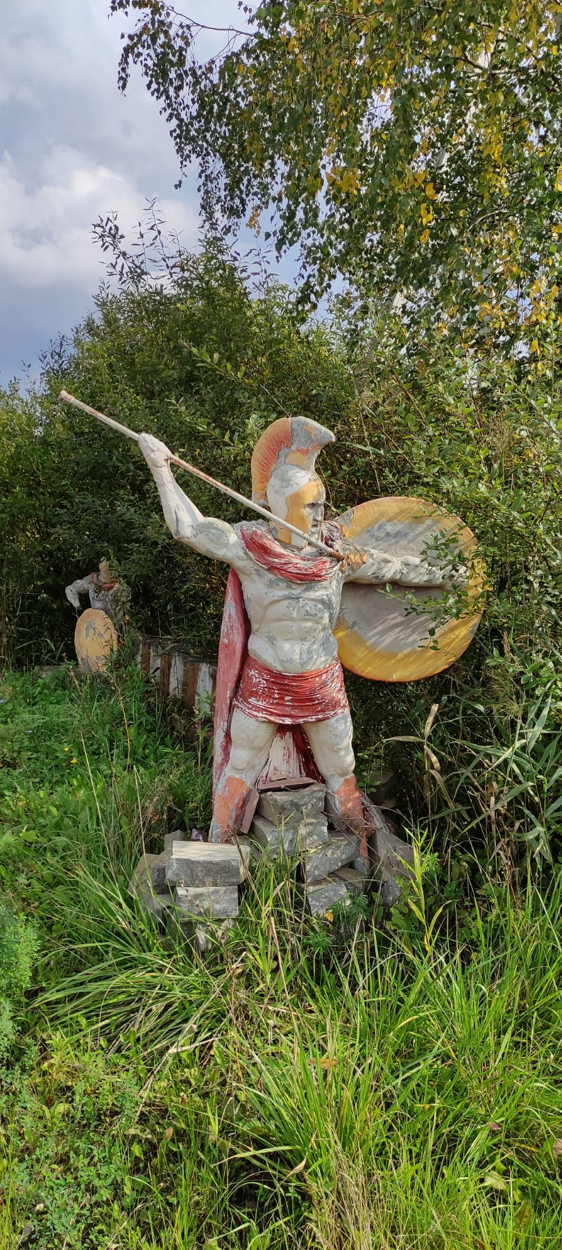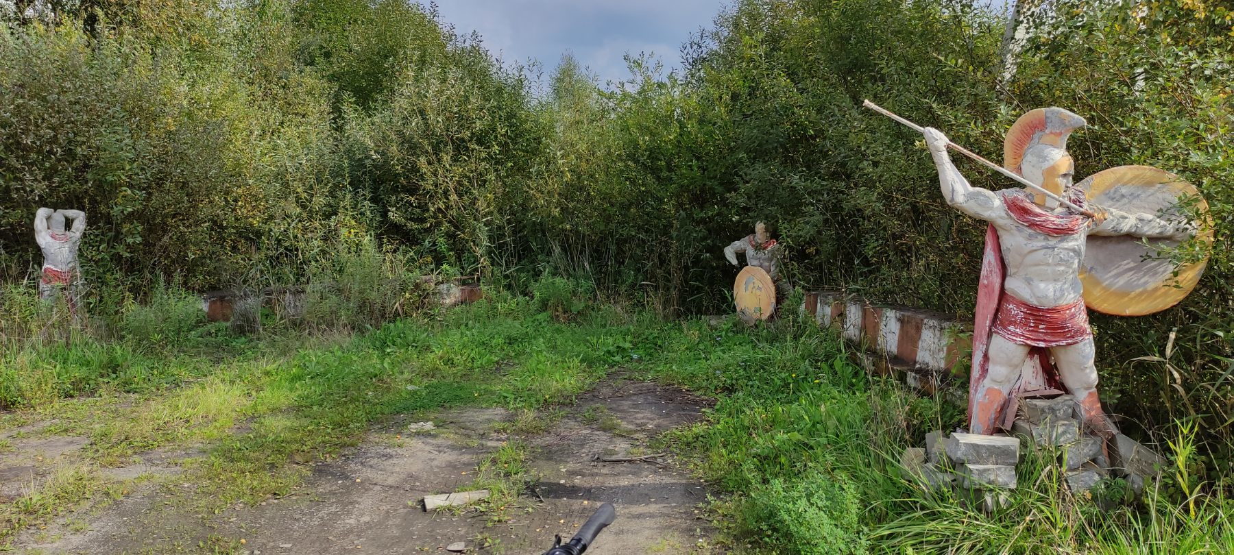 Увлекаюсь велосипедом и постоянно катаюсь по всем окрестным городам, деревням и посёлкам. Иногда натыкаюсь на красивые или интересные штуки, дома нестандартные, арт объекты и прочее. Пару лет назад наткнулся на памятник Пушкину в деревне Красная Дубрава. Прям в кустах стоял. Думал это достаточно странно. Но сегодняшний случай был конкретно так страннее. Итак встречайте, спартанцы! Посёлок Новый Снопок, на выезде возле дороги в кустах рядом с магазином стройматериалов стоят. У меня сразу куча вопросов. Откуда они тут, кто их поставил, кто их сделал, почему именно тут. Боюсь этого мы никогда не узнаем. Возможно это памятник храбрым Сноповцам защитившим свои магазины от полчищ дачников. В общем я что хочу сказать, почаще вертите головой, странная фигня она всегда рядом