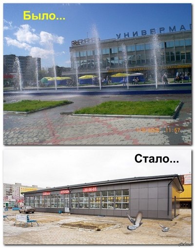 да,вместо прекрасного фонтана,где я летом ловил брызги свежести,построили магазин люстр,его сожгли активисты,после там построили магазин обуви