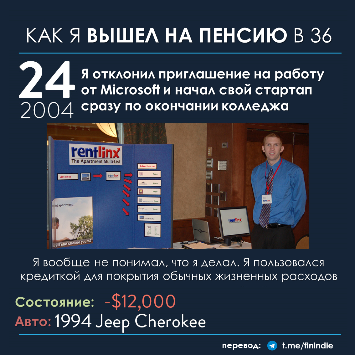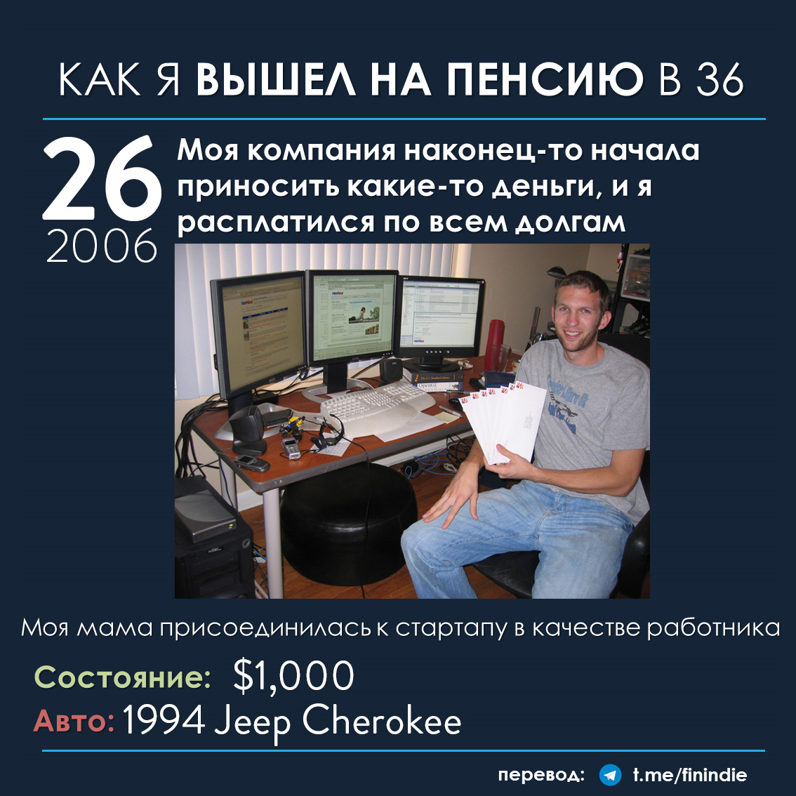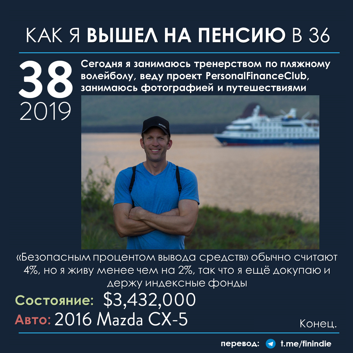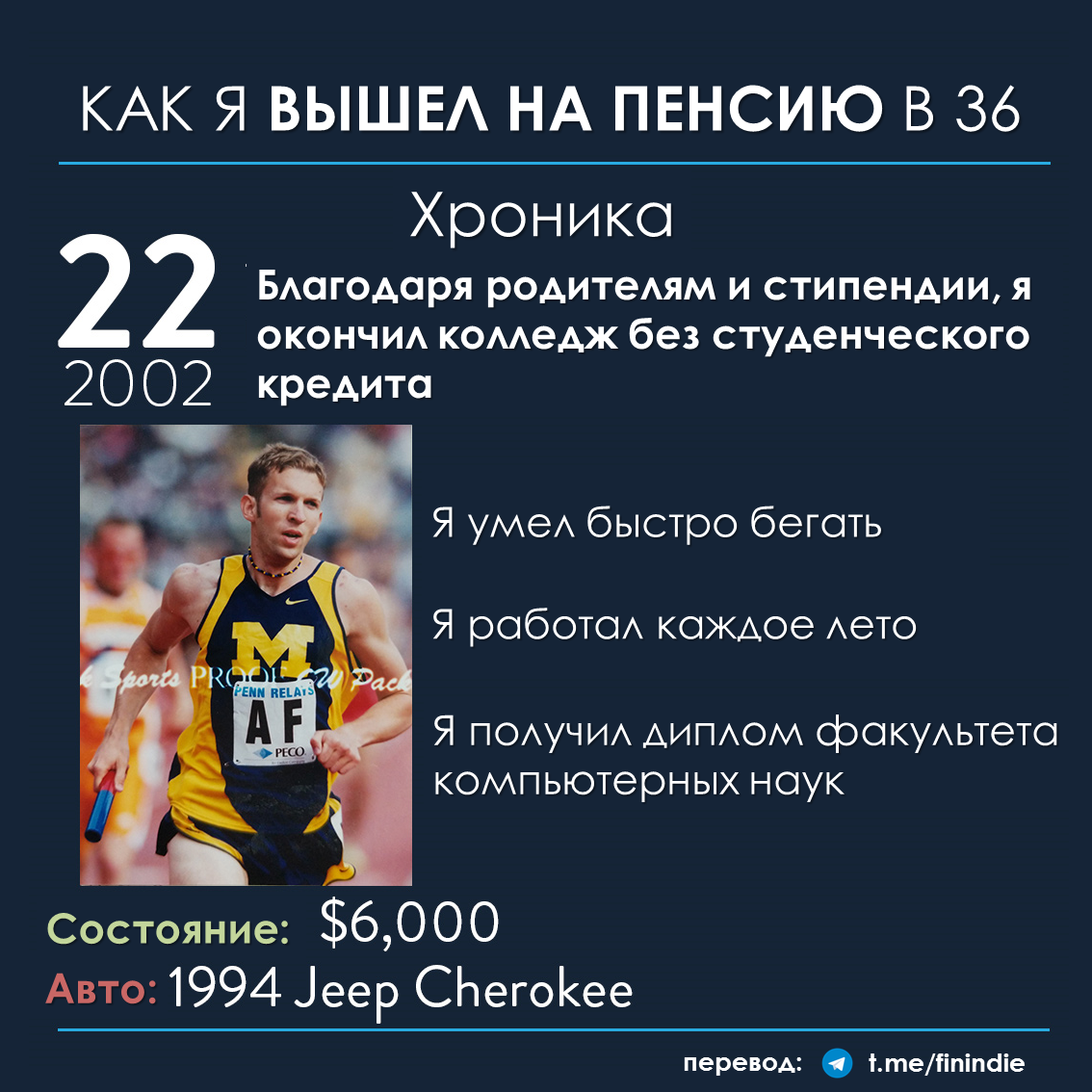 Сначала небольшой дисклеймер: каждая история о "ранней пенсии" (история №1 здесь, история №2 здесь) - это история о "чемпионе в беге на длинную дистанцию". Не совсем правильно проецировать эту историю на себя, корить себя за то, что вы не смогли бы победить чемпиона в его виде спорта или критиковать чемпиона за какую-то неправильную (по вашему мнению) тактику бега... Но у чемпионов всегда есть чему поучиться :) Отнеситесь к статье как к развлекательному контенту, заставляющей задуматься о каких-то деталях нашей жизни, а не как к призыву к каким-либо действиям.
