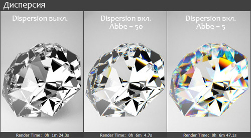 Ну, тут просто вопрос внутренней терминологии среды моделирования. Возникновение дисперсии в модели зависит от свойств материала, а именно, от показателя преломления (IOR) и от силы аббераций (Abbe). И объекты, преломленные в материале, будут диспергировать и аберрировать.