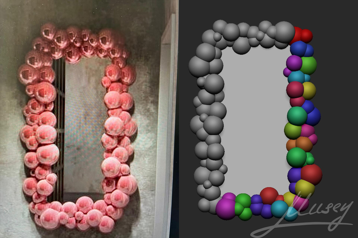 Когда ко мне пришёл заказ на создание рамки для зеркала, я сразу понял — будет что-то необычное. Вместо привычных форм клиент захотел «живую» композицию из сфер, которые будто прилипают к стене и обтекают зеркало.