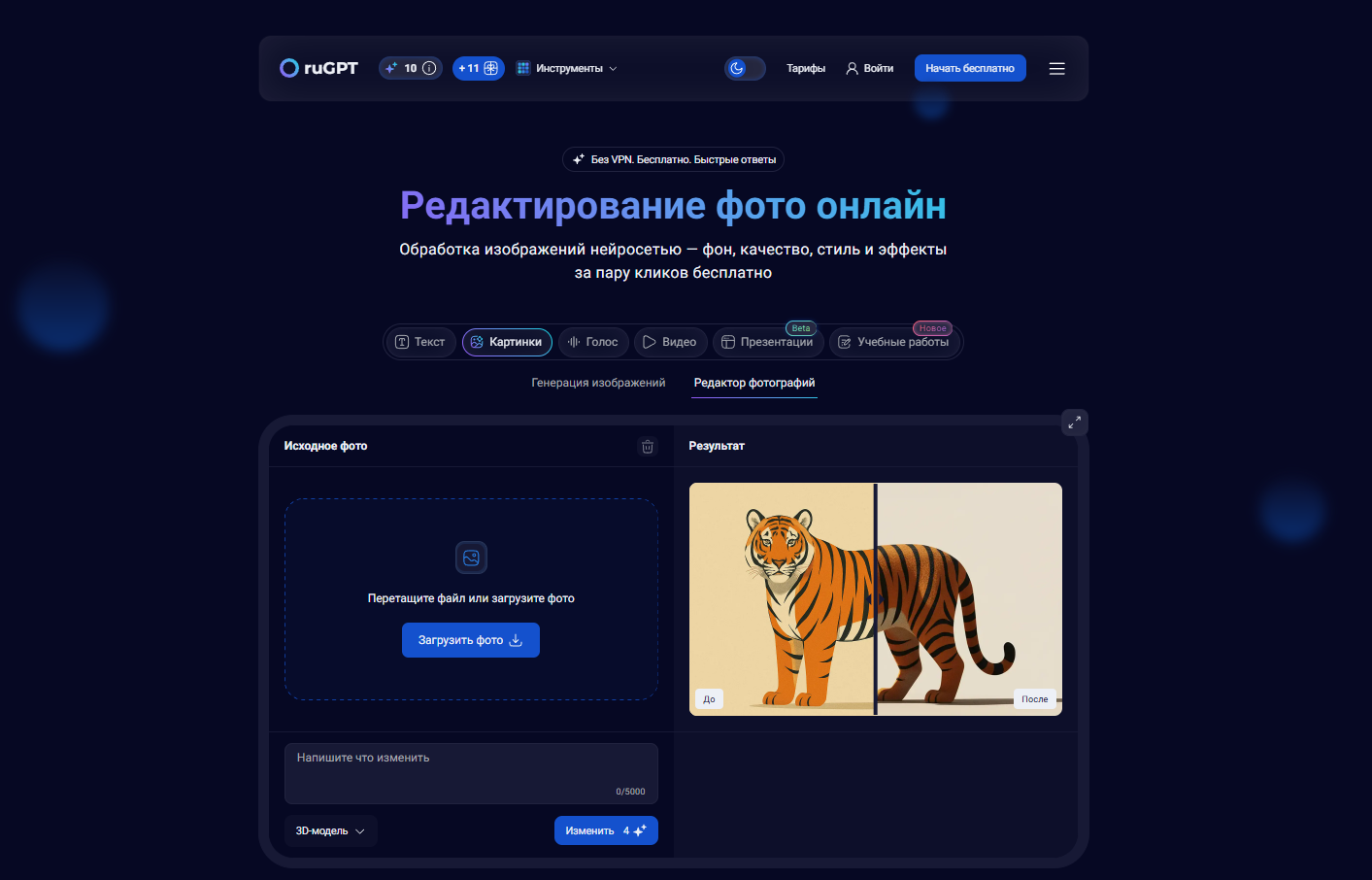 ruGPT io — это универсальный агрегатор нейросетей, объединяющий инструменты для редактирования и обработки изображений, создания 3D-аватарок и стильных визуальных эффектов. Сервис позволяет загрузить обычное фото и за несколько секунд превратить его в реалистичную объёмную модель, улучшить качество, убрать фон или придать художественный стиль. Всё работает прямо в браузере — без установки программ, регистрации и VPN. Платформа сочетает десятки моделей искусственного интеллекта, обеспечивая точную работу с деталями, светом и объёмом, что делает её удобной для блогеров, дизайнеров, фотографов и всех, кто хочет быстро получить профессиональный результат.