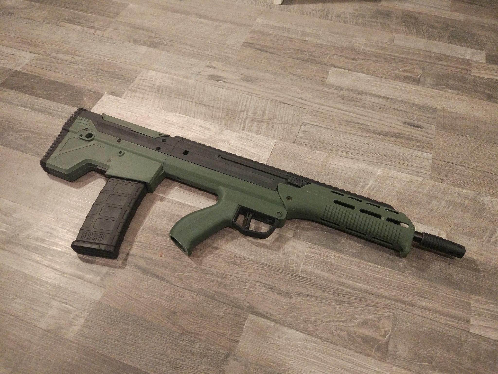 Хочу поделиться 3D-печатным приводом. Я планировал сделать винтовку, похожую на Desert tech MDR, однако некоторые размеры осознанно изменены для улучшения эргономики или надежности привода. Внутри печатный гирбокс, держит пружины до 150. Внутри гирбокса детали для третьего гира. Стволик 455мм, общая длина 660мм. Магазины М-серии.