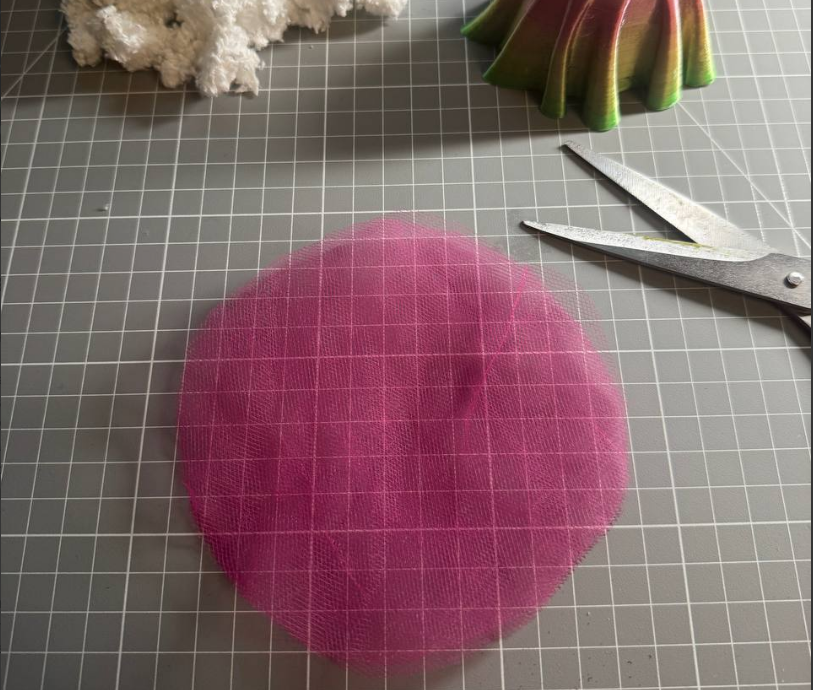 1. Вырезаем круг диаметром 10–12 см сразу из 4 слоёв фатина (чтоб не мучиться потом).
