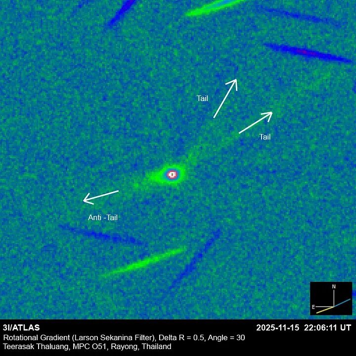 Теперь джеты, ака выхлопы двигателей расположены перпендикулярно друг другу и примерно под углом в 45 градусов к оси Атлас-Солнце. То есть, что то там наша комета "движками подрабатывает".👌😁