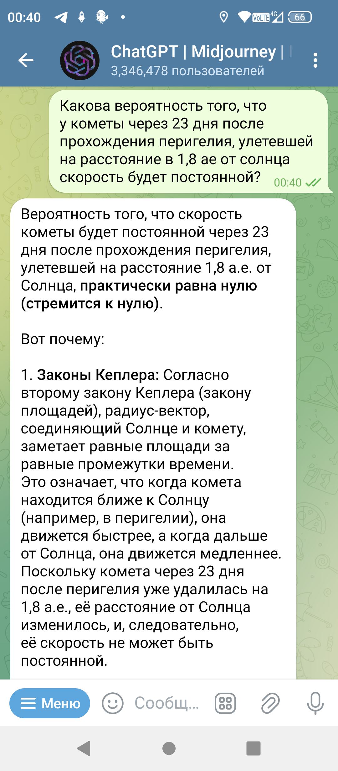 Спрашиваю чатик : "Есть космический обьект. Непонятно, искусственный или природный. Прошел перигелий на расстоянии 1,3 ае от солнца, улетает из солнечной системы. Скорость стабильно падала в течение 21 дня после перигелия - с 58 км/сек до 50,3 км/сек через 21 день.