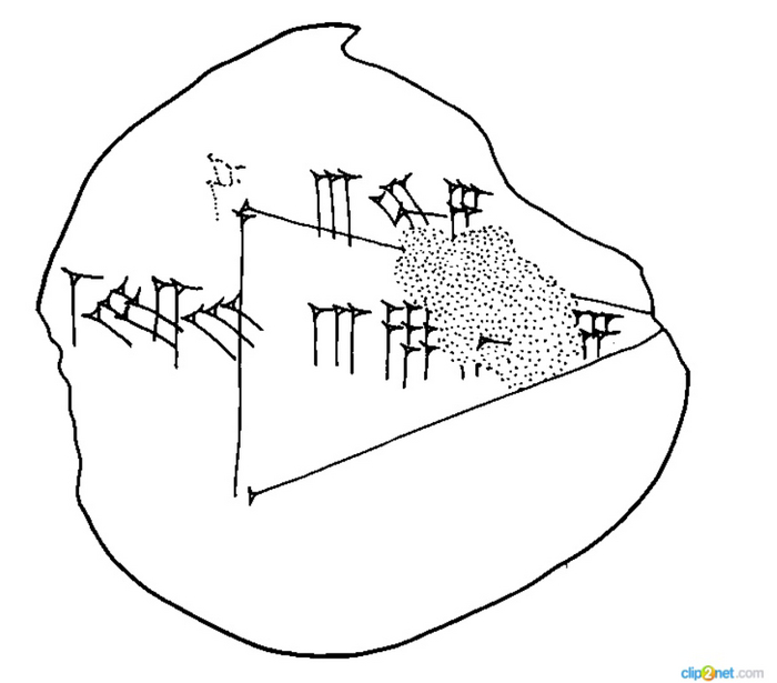 Табличка маленькая, всего лишь чуть больше 8 см в диаметре, а на ней изображён прямоугольный треугольник с тремя группами клинописных символов: по одной у каждого из катетов и одна по центру. Как нетрудно догадаться, это записаны числа — длины катетов, и площадь треугольника в центре. А вот дальше начинается веселье.
